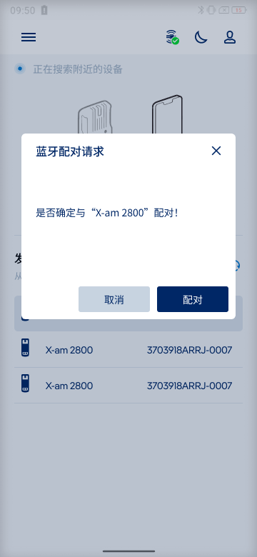 点击需要连接的Dräger气体检测仪,此时系统弹出蓝牙配对请求对话框。点击对话框里的配对按钮,APP将与Dräger气体检测仪进行蓝牙配对连接。