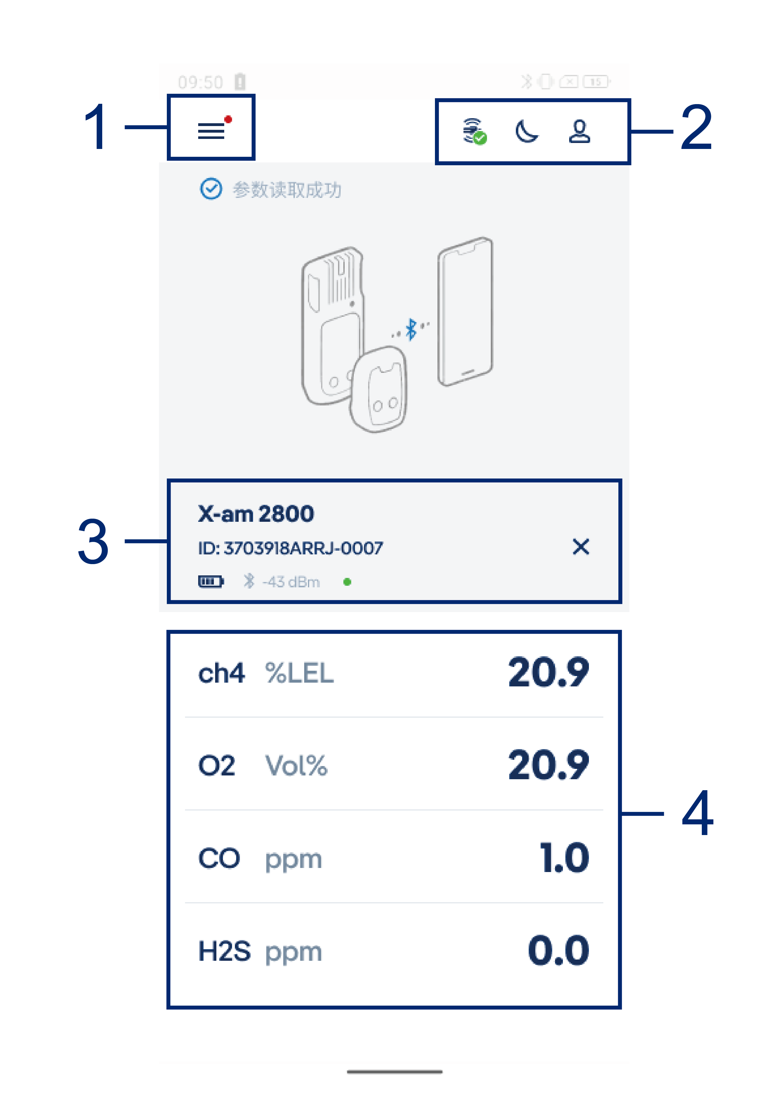 进入Gas Detection Connect工作界面后,APP通过蓝牙实时连接气体检测仪并读取所连设备的状态和气体参数。Gas Detection Connect工作界面可划分为4个功能块: