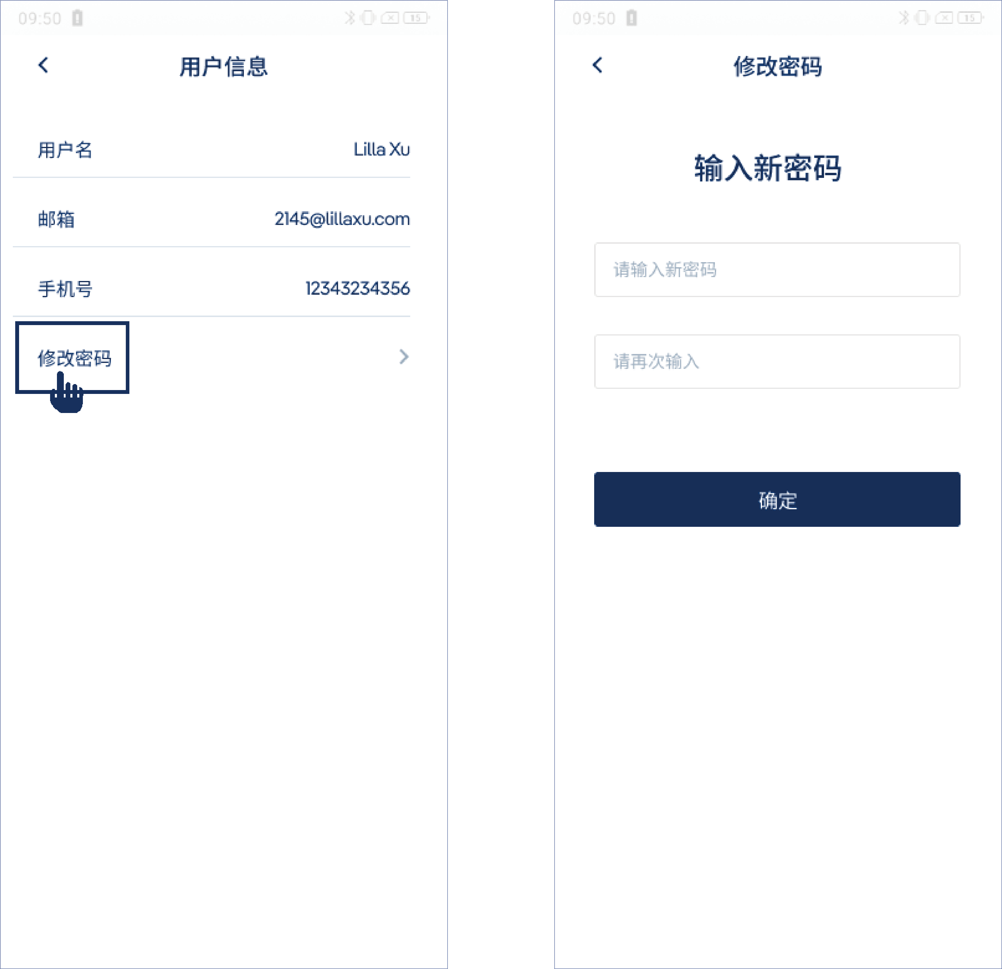 点击将显示账户个人信息,包括用户名、邮箱、手机号等。点击“修改密码”可修改用户密码修改。