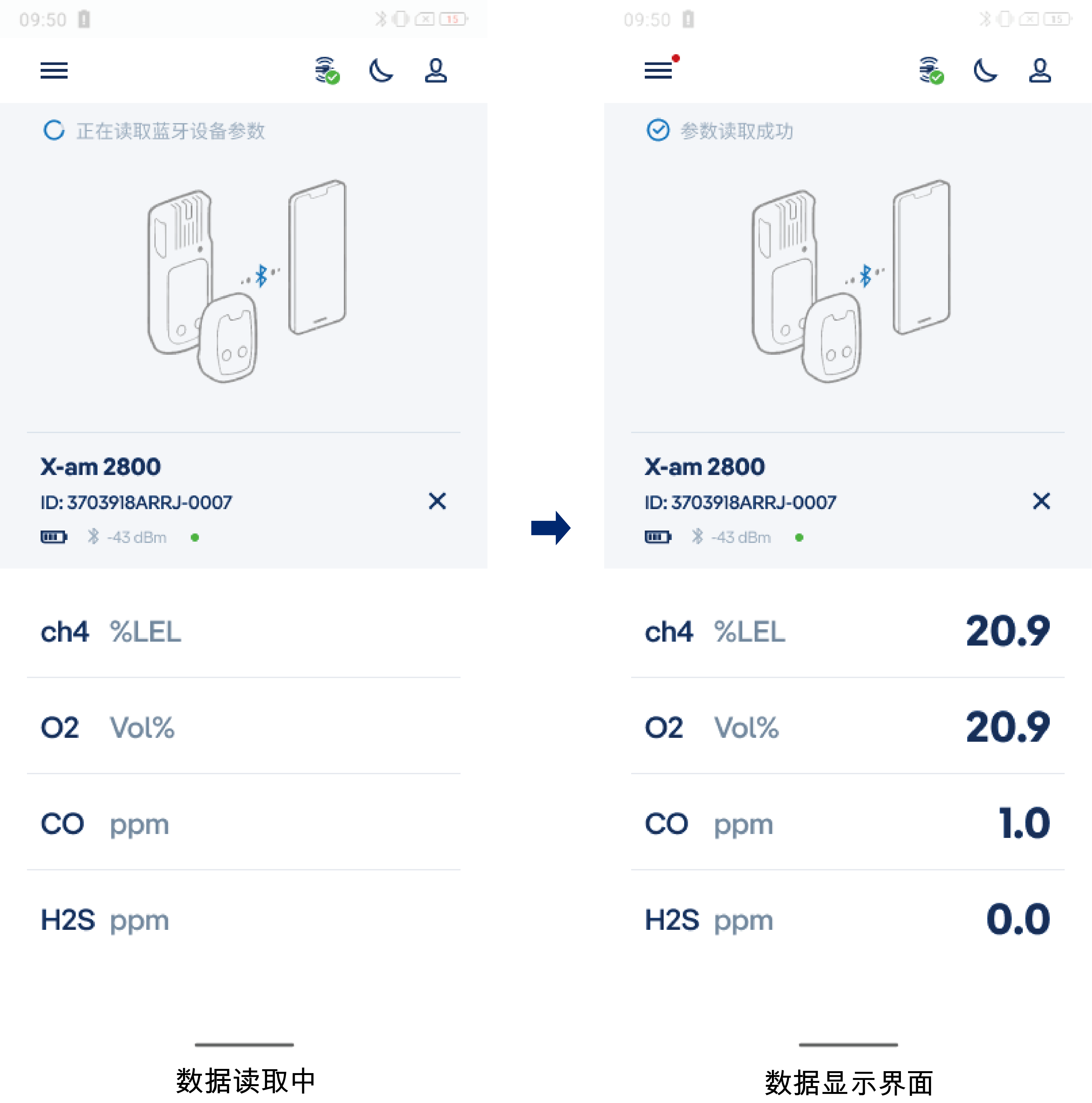 蓝牙配对连接耗时约20秒。连接成功后,APP将会读取并显示气体检测仪的相关参数: