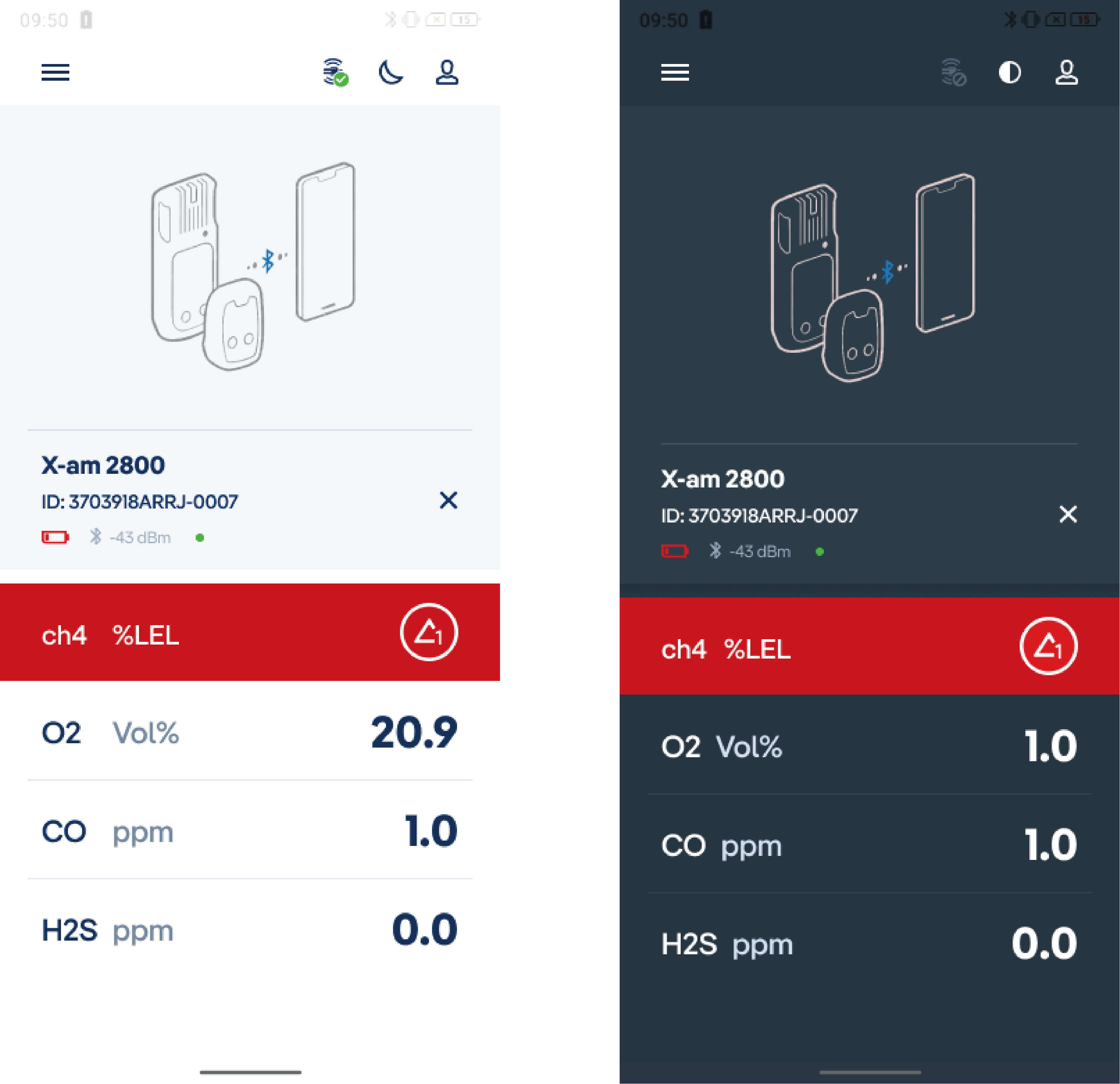 设备状态界面显示通过蓝牙连接的Dräger气体检测仪,并实时显示气体检测仪的设备型号、序列号、电量和蓝牙信号强度信息。