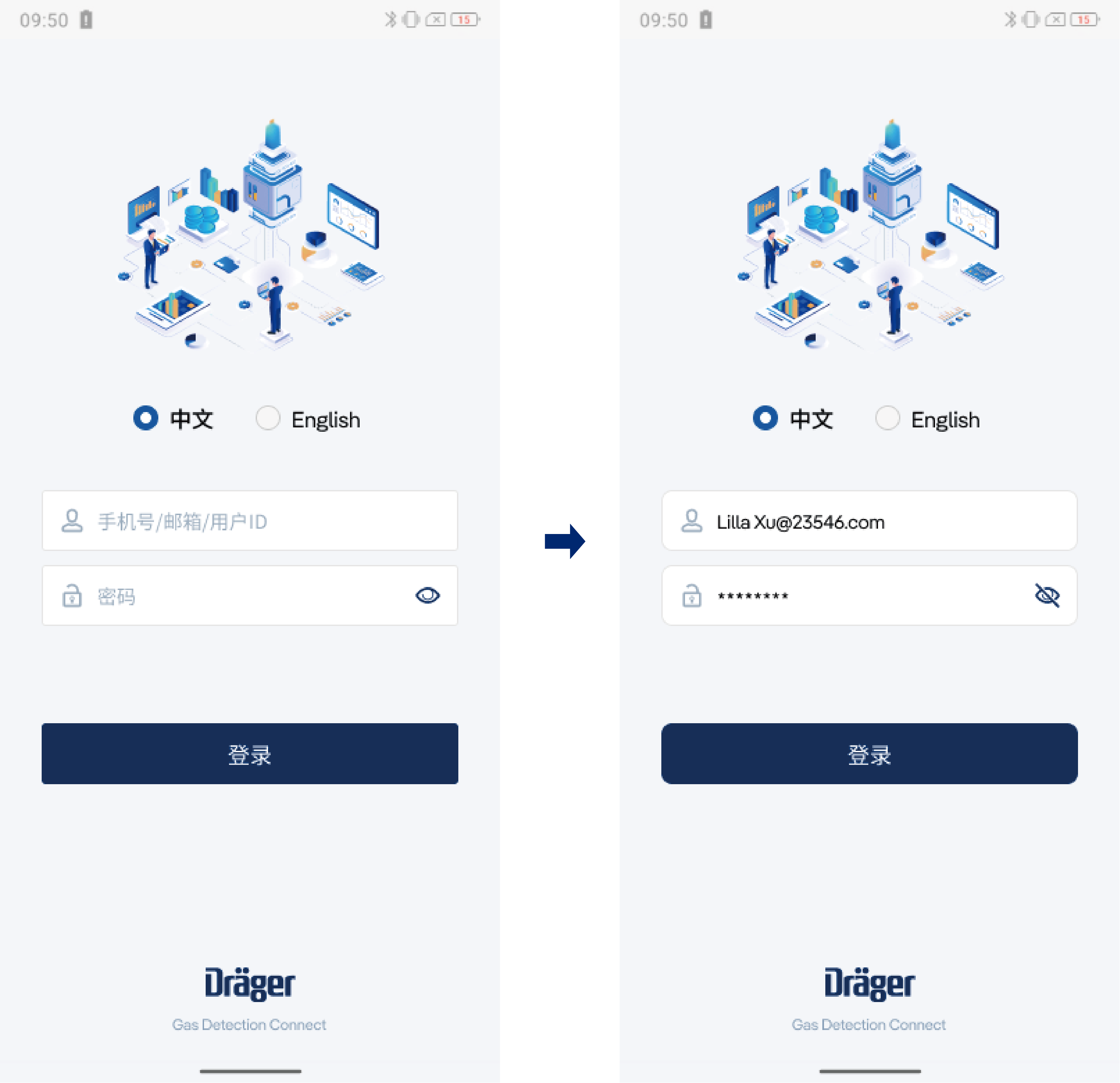 打开 APP即可进入Gas Detection Connect系统登录界面。如果您已经拥有Gas Detection Connect账号,请输入您的用户名、手机号码或邮箱,输入密码后,点击登录按钮,即可登录系统(如果您是首次使用Gas Detection Connect系统,请通过企业管理员或者联系Dräger帮助中心获取账户名和密码)。