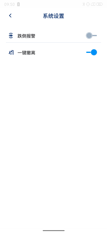 点击系统设置,出现系统设置界面,在此界面内,可以设置“跌倒报警”和“一键撤离”选项:
