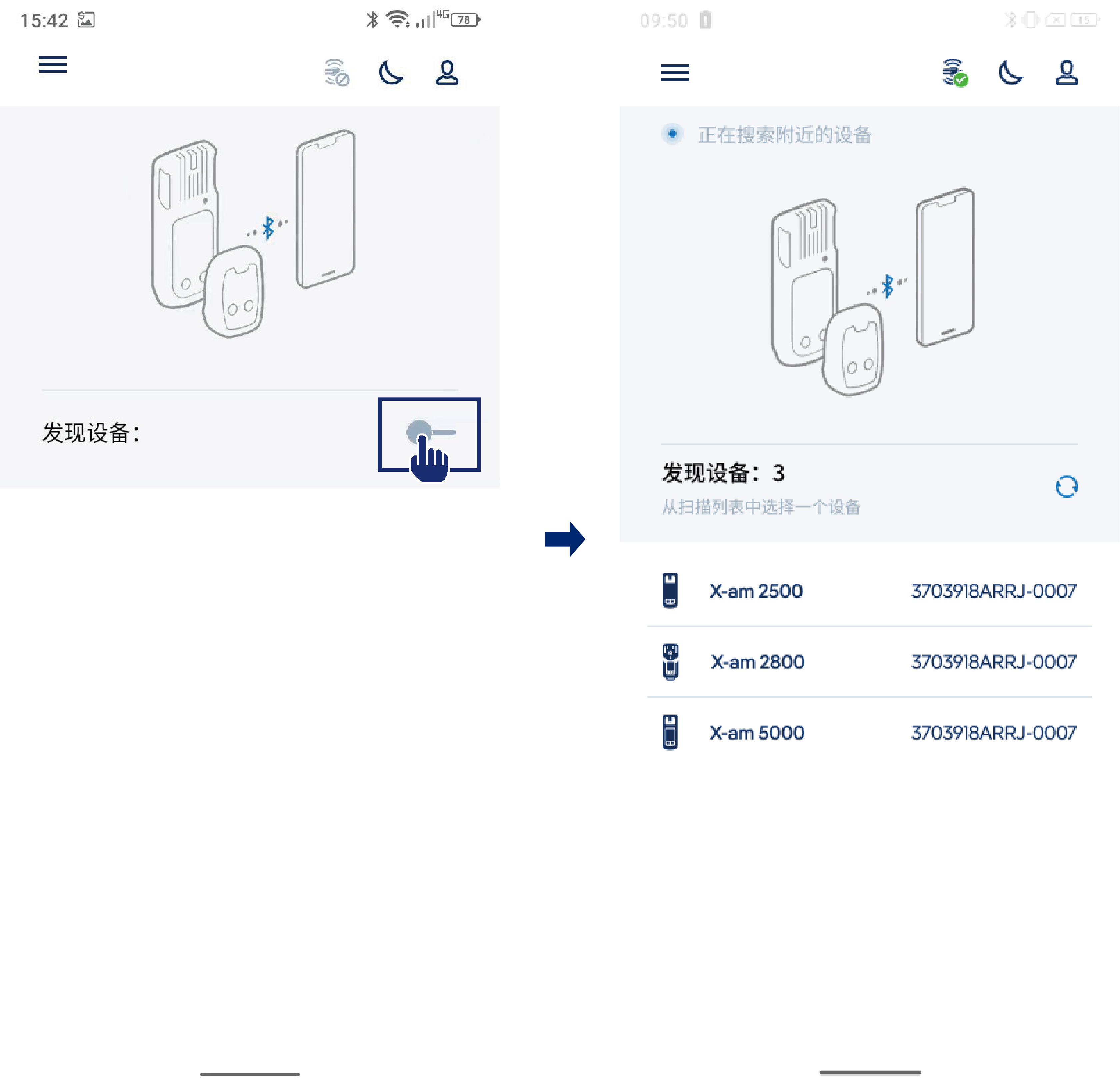 登录后进入设备搜索界面。打开发现设备按钮(下图框内所示滑动按钮)(此时需要确保Dräger气体检测仪已打开,并且手机蓝牙已启用)。系统将会扫描附近支持蓝牙连接的Dräger气体检测仪,并将设备的型号和序列号显示在发现设备列表中。